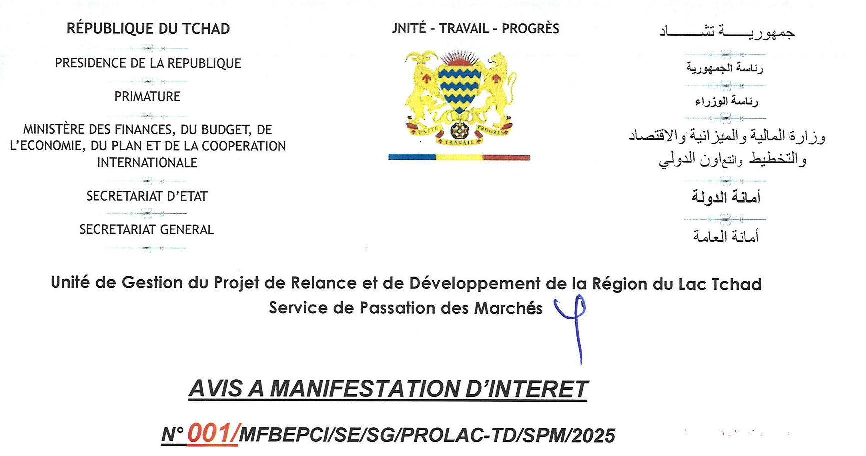 Relatif au Recrutement d’un Bureau/Cabinet d’Etudes pour l’Evaluation Finale du Projet de Relance et De Développement de la Région du Lac Tchad (PROLAC-TCHAD).