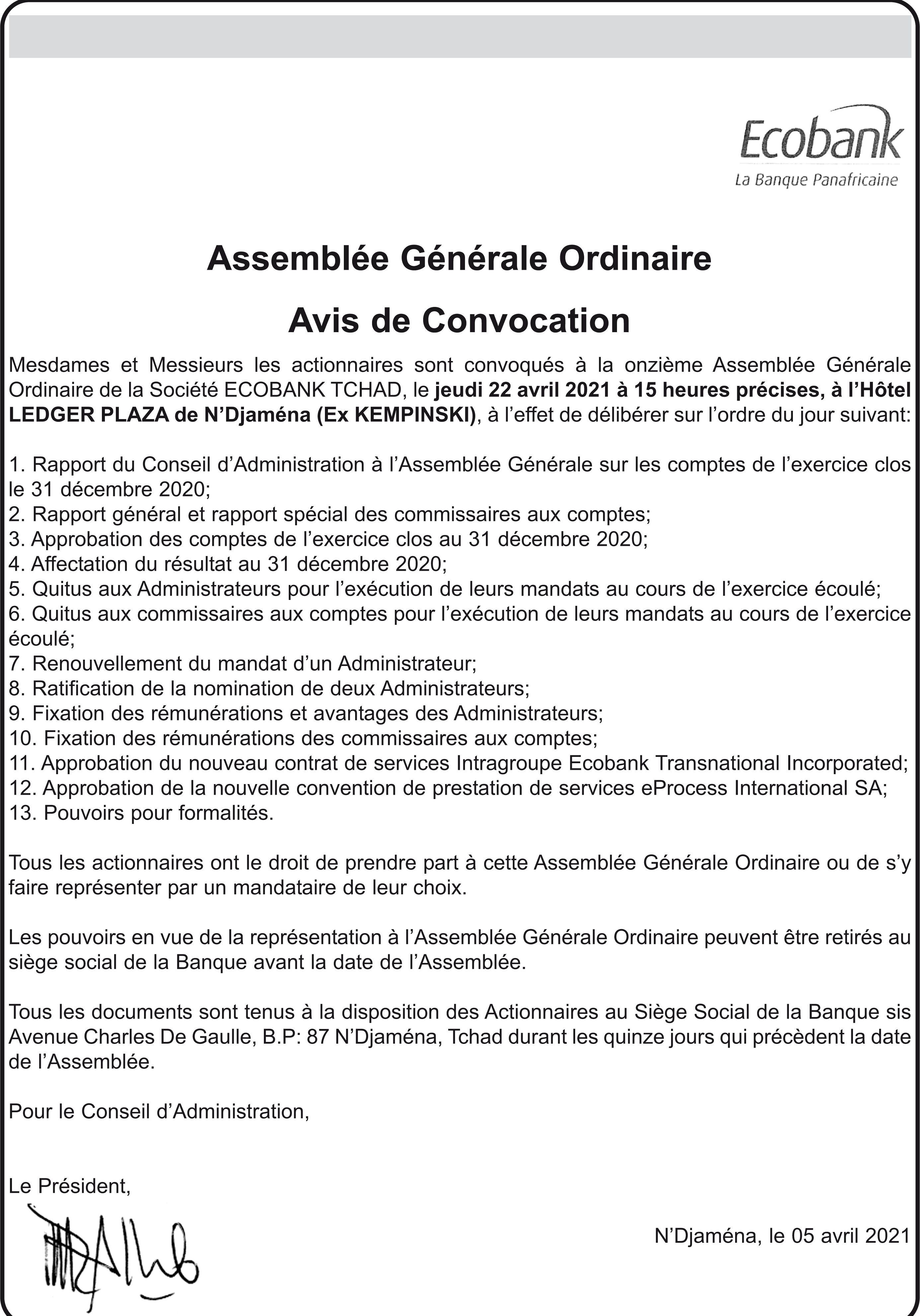 Mesdames et Messieurs les actionnaires sont convoqués à la onzième Assemblée Générale Ordinaire de la Société ECOBANK TCHAD, le jeudi 22 avril 2021 à 15 heures précises, à l’Hôtel LEDGER PLAZA de N’Djaména (Ex KEMPINSKI), à l’effet de délibérer sur l’ordre du jour suivant: