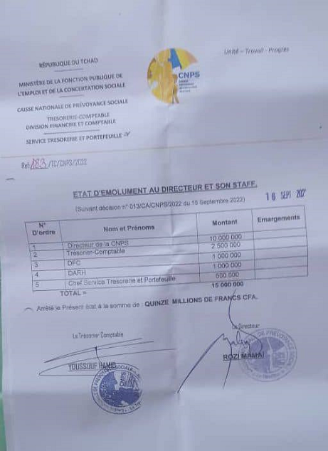 Selon cette source qui a requis l’anonymat, un matin le directeur de la Cnps en compagnie de deux cadres de son staff et un responsable d’une centrale syndicale expert en décoration, sont allés convaincre le Président du conseil d’administration (Pca) de décerner une lettre de félicitation (témoignage de satisfecit en somme) au directeur pour ses “performances”, alors qu’il n’est en fonction que depuis six mois. “Le Pca s’est vu contraint d’accepter d’avaliser cette mise en scène (deal), étant donné qu’il vient de bénéficier de la faveur du directeur Rozi Mamai, qui a recruté le mois passé sans test, son fils (Bichara Abdel Fakhara Doudoua) en qualité d’informaticien à la Cnps”, dénonce notre source. Le 16 septembre 2022, le Pca en compagnie d’un seul administrateur, est allé remettre en catimini et dans un cadre restreint, une lettre d’encouragement au directeur, en présence de quelques cadres maison choisis. Le partage du butin a suivi la cérémonie de décoration du directeur, qui s’est dit “soucieux de la situation des veuves et orphelins” (sic !), tout en empochant sans honte, la rondelette somme de 10 millions de francs (voir fac similé état de paiement n° 183/TC/CNPS/2022 du 16 sept 2022).