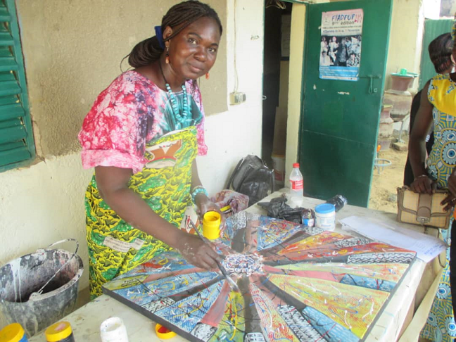 Elle a suivi un cursus normal à l’école jusqu’à l’obtention de son bac option comptable. Mais elle était dans tous les évènements culturels et artistiques, en lien avec l’art plastique pour assouvir sa passion. Ce qui l’amène à se décider à partir de 2013. C’est là qu’elle approche l’artiste plasticien burkinabé Zackaria Ouédraogo, qui a bien voulu lui tenir la main et lui apprendre le métier de dessin et peinture, en étant son maître et professeur. Et c’est depuis 2017, qu’elle a commencé par exposer ses œuvres jusqu’à nos jours. En 2018, elle obtient son brevet de qualification professionnelle en art plastique, qui lui permet d’enseigner, et depuis 2019 en tant que formatrice en art, elle travaille avec les enfants sur ce qu’elle sait faire, dit-elle, ravie.