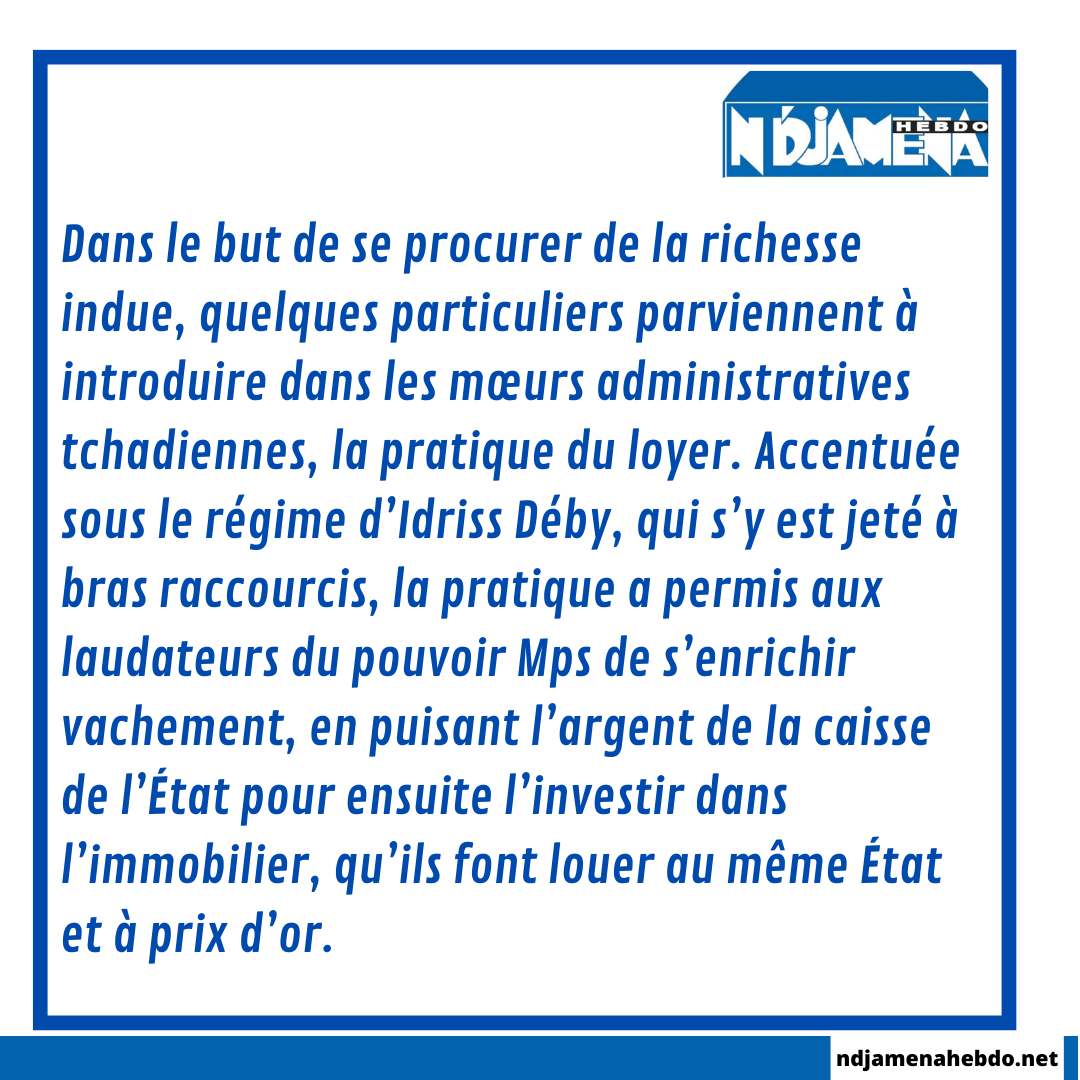 Dans le but de se procurer de la richesse indue, quelques particuliers parviennent à introduire dans les mœurs administratives tchadiennes, la pratique du loyer. Accentuée sous le régime d’Idriss Déby, qui s’y est jeté à bras raccourcis, la pratique a permis aux laudateurs du pouvoir Mps de s’enrichir vachement, en puisant l’argent de la caisse de l’État pour ensuite l’investir dans l’immobilier, qu’ils font louer au même État et à prix d’or.